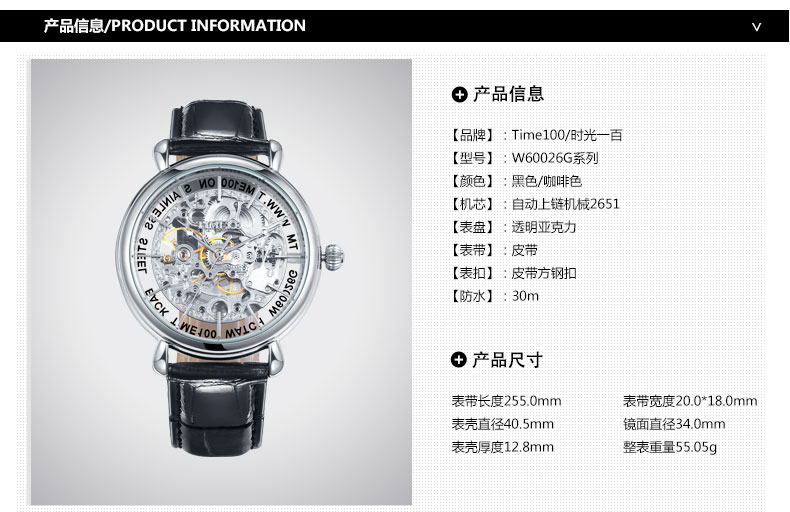 当前位置:首页 > TIME100全自动镂空真皮机械表男表W60026G